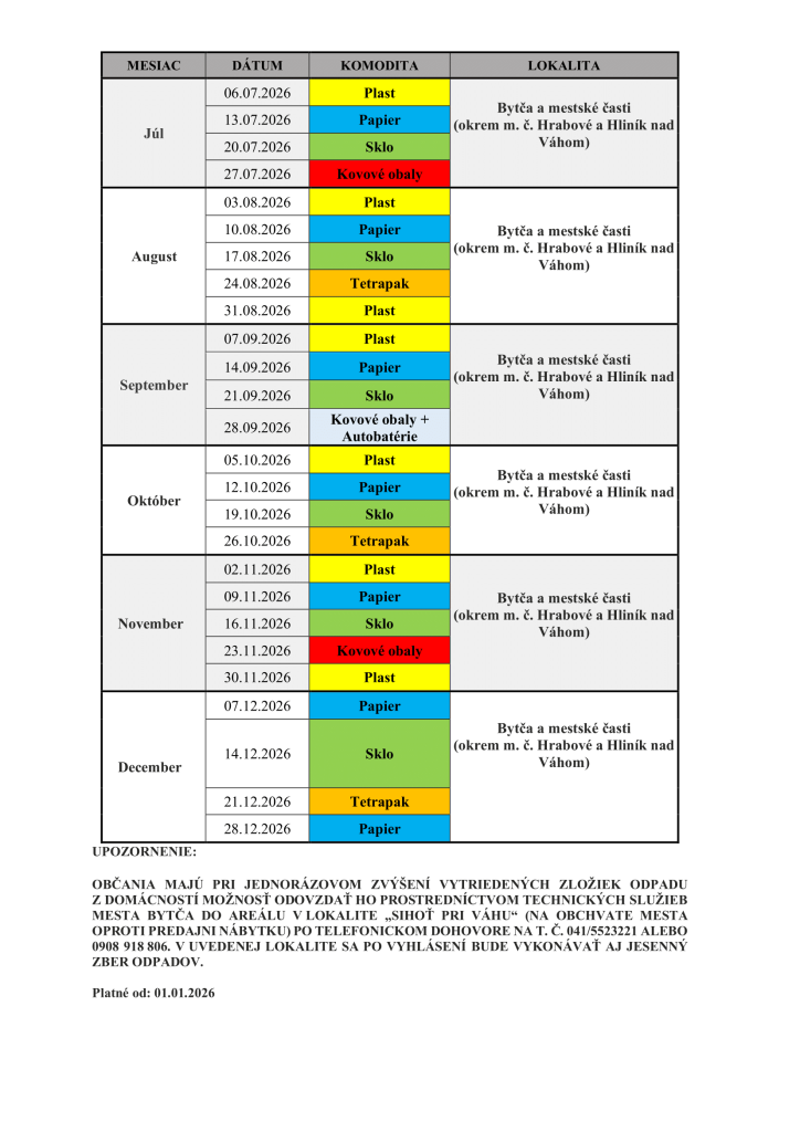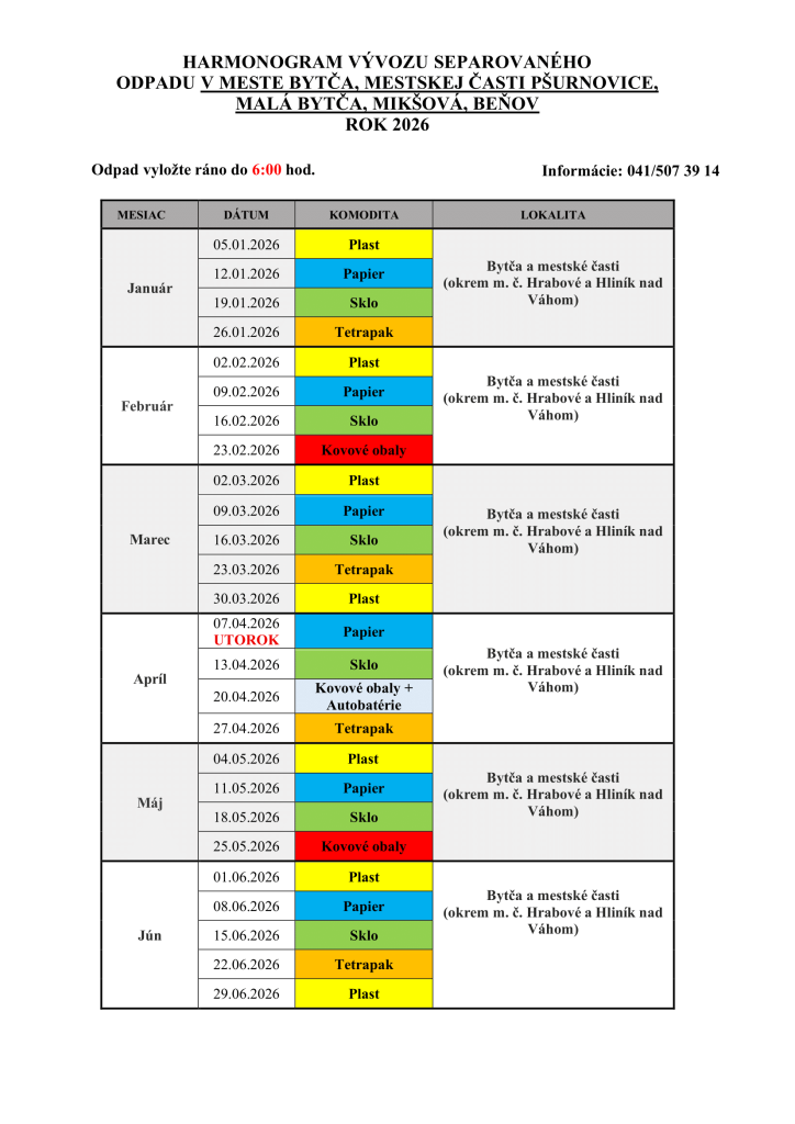 Prinášame vám harmonogram vývozu odpadov na rok 2026 pre mesto Bytča a jeho mestské časti. Harmonogram bude dostupný aj v tlačenej podobe ako súčasť Bytčianskeho spravodaja alebo si ho môžete vyzdvihnúť pri podateľni Mestského úradu.
