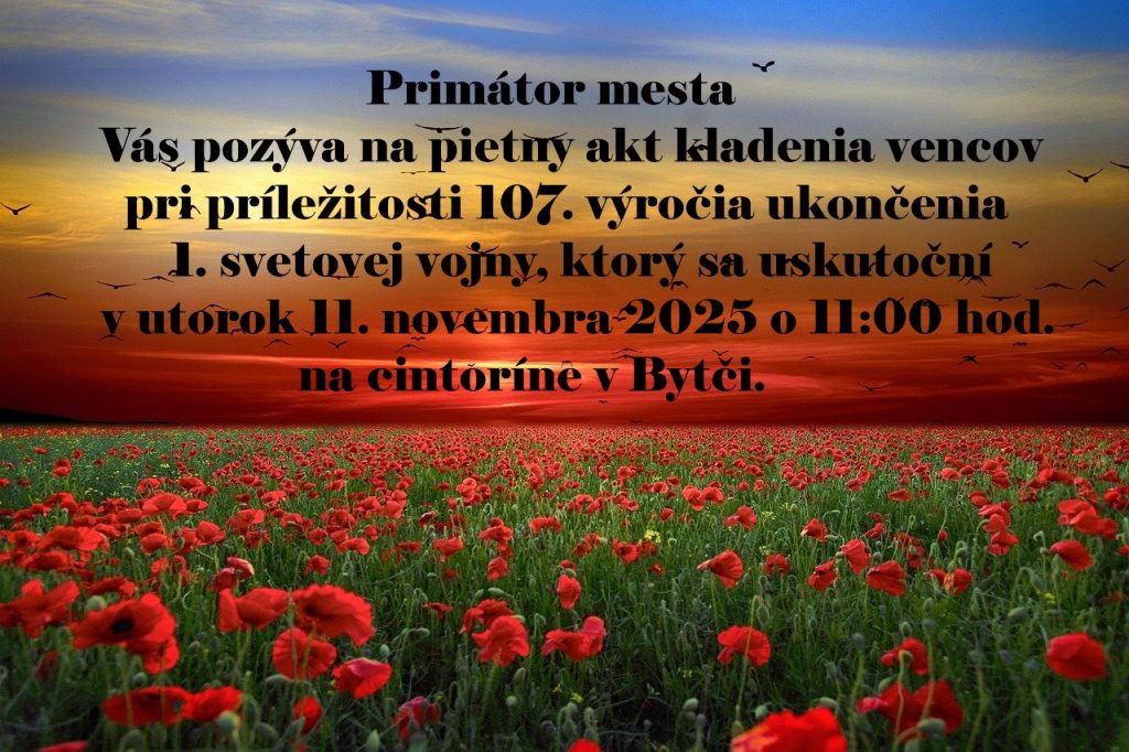 Primátor mesta Bytča pozýva verejnosť na pietny akt kladenia vencov pri príležitosti 107. výročia ukončenia 1. svetovej vojny.